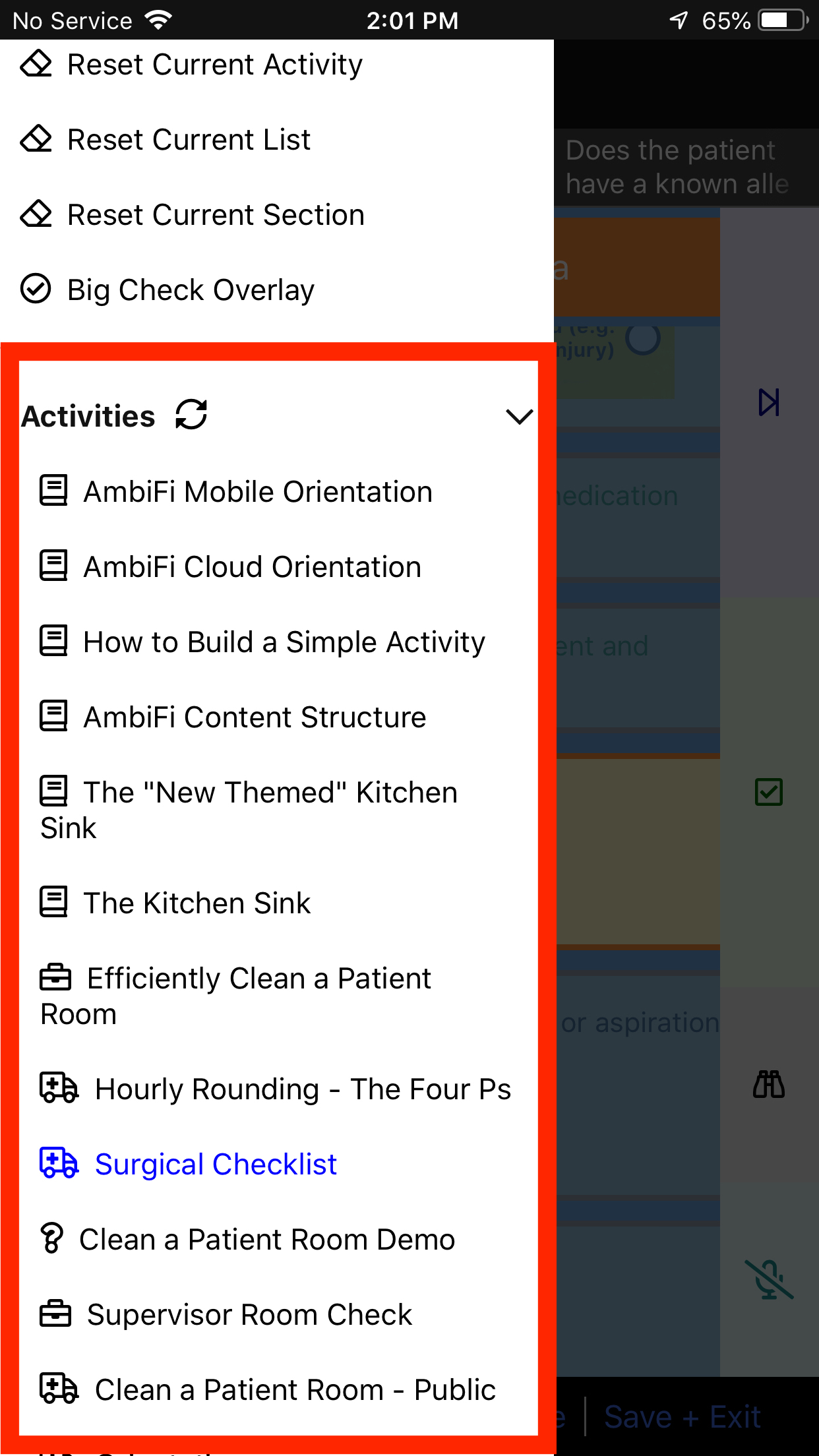 Checkbar - The checkbar provides options while using the Activity such as checking an item, turning on the microphone, and a few others. See below to see how the checkbar looks on screen.