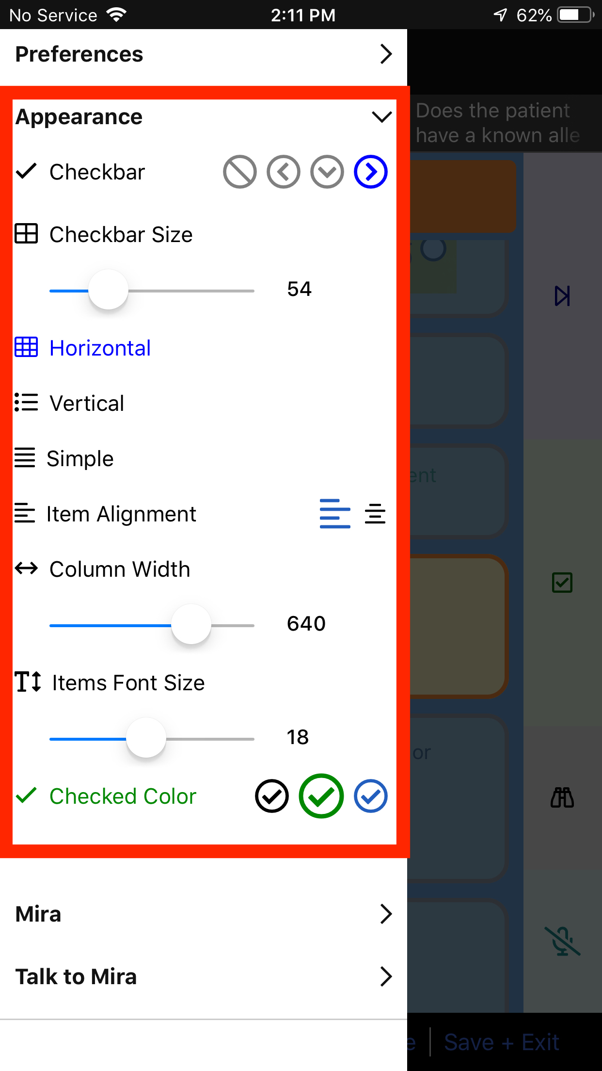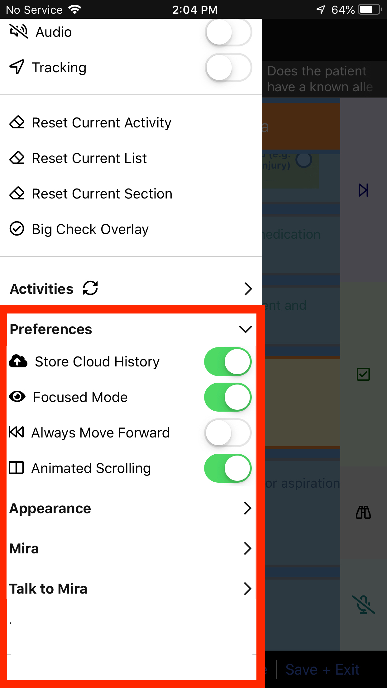 - Toggles sound on and off (enable or disable Mira reading checklists)