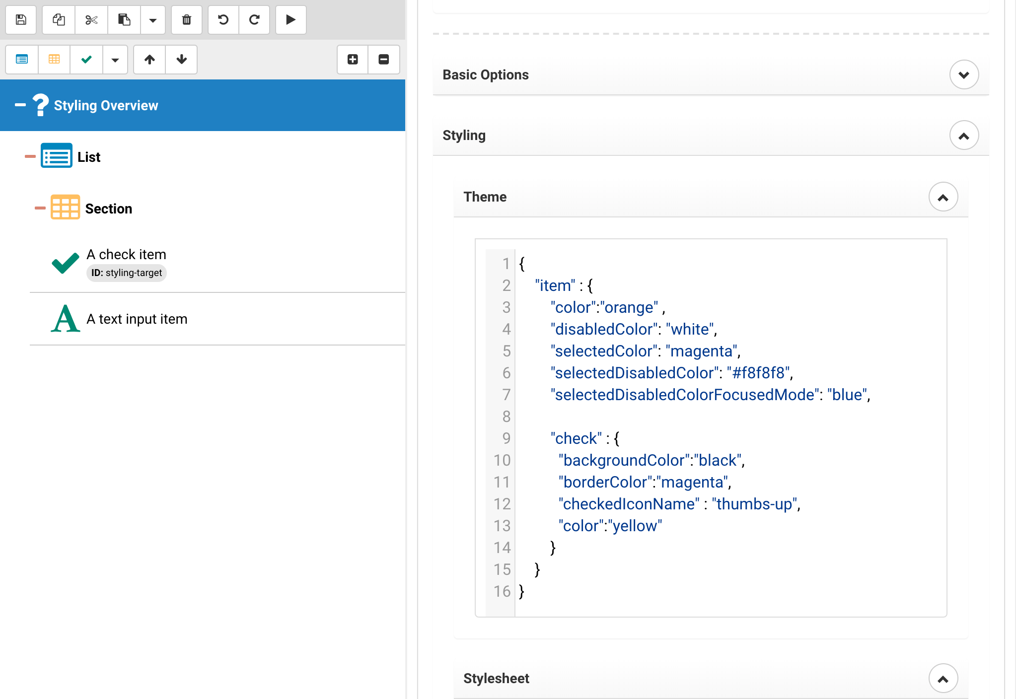 { "item" : { "color":"orange" , "disabledColor": "white", "selectedColor": "magenta", "selectedDisabledColor": "#f8f8f8", "selectedDisabledColorFocusedMode": "blue", "check" : { "backgroundColor":"black", "borderColor":"magenta", "checkedIconName" : "thumbs-up", "color":"yellow" } } }