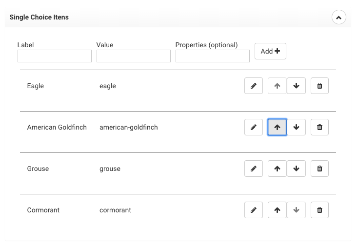 - Set 4 choices by entering labels (which will be shown to the user) and values (which we will reference)