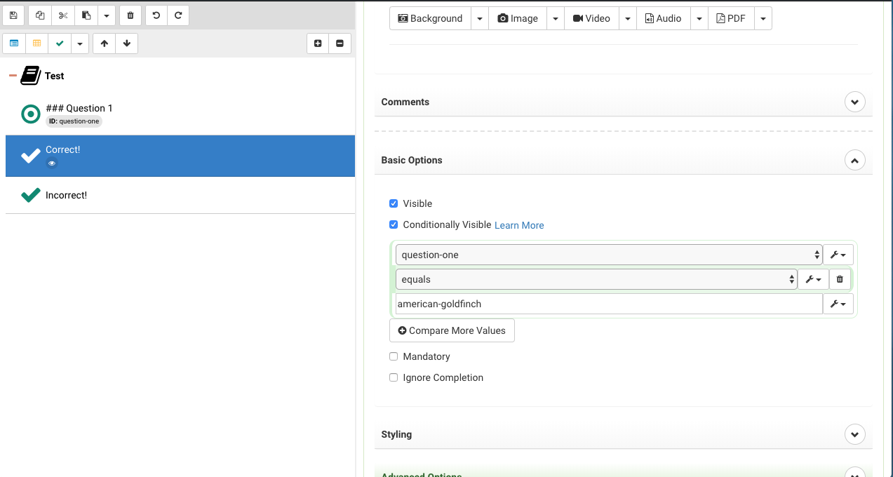 This will make the current item conditionally visible based on the user's choice of Yes or No on the item we created. For more information on the types of comparators, click here.