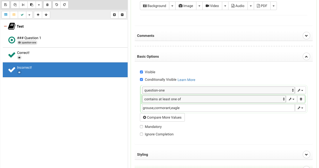 This is a simple example of how user input in the form of multiple choice can questions can be verified using conditional visibility.