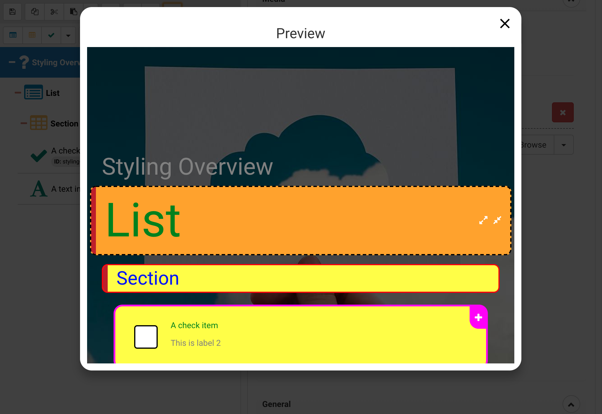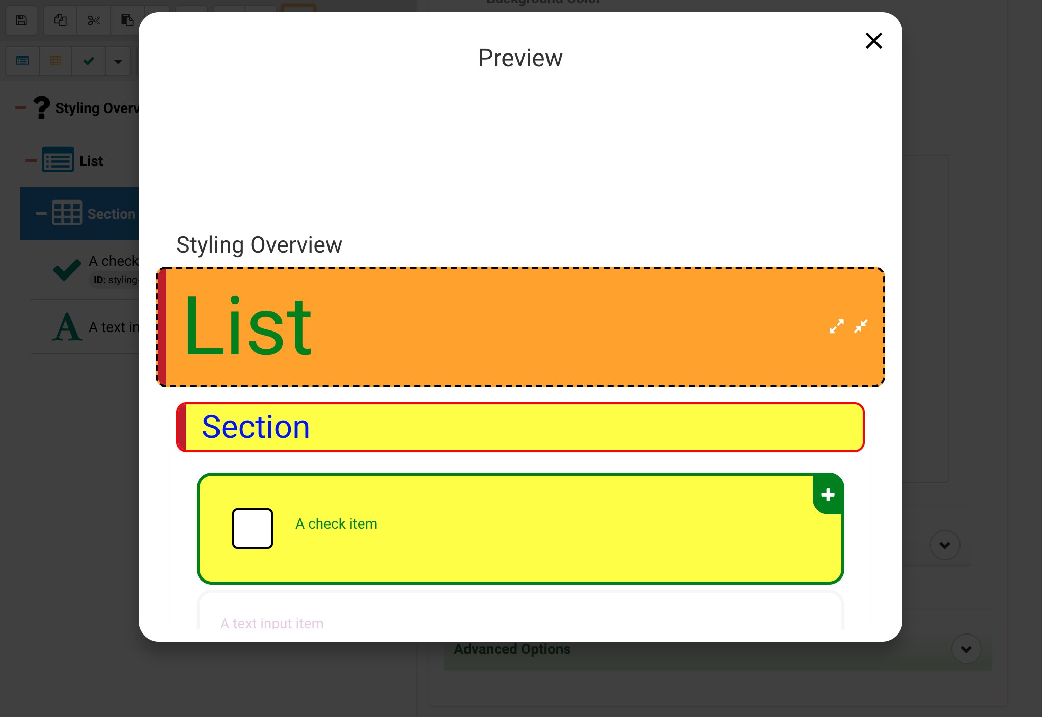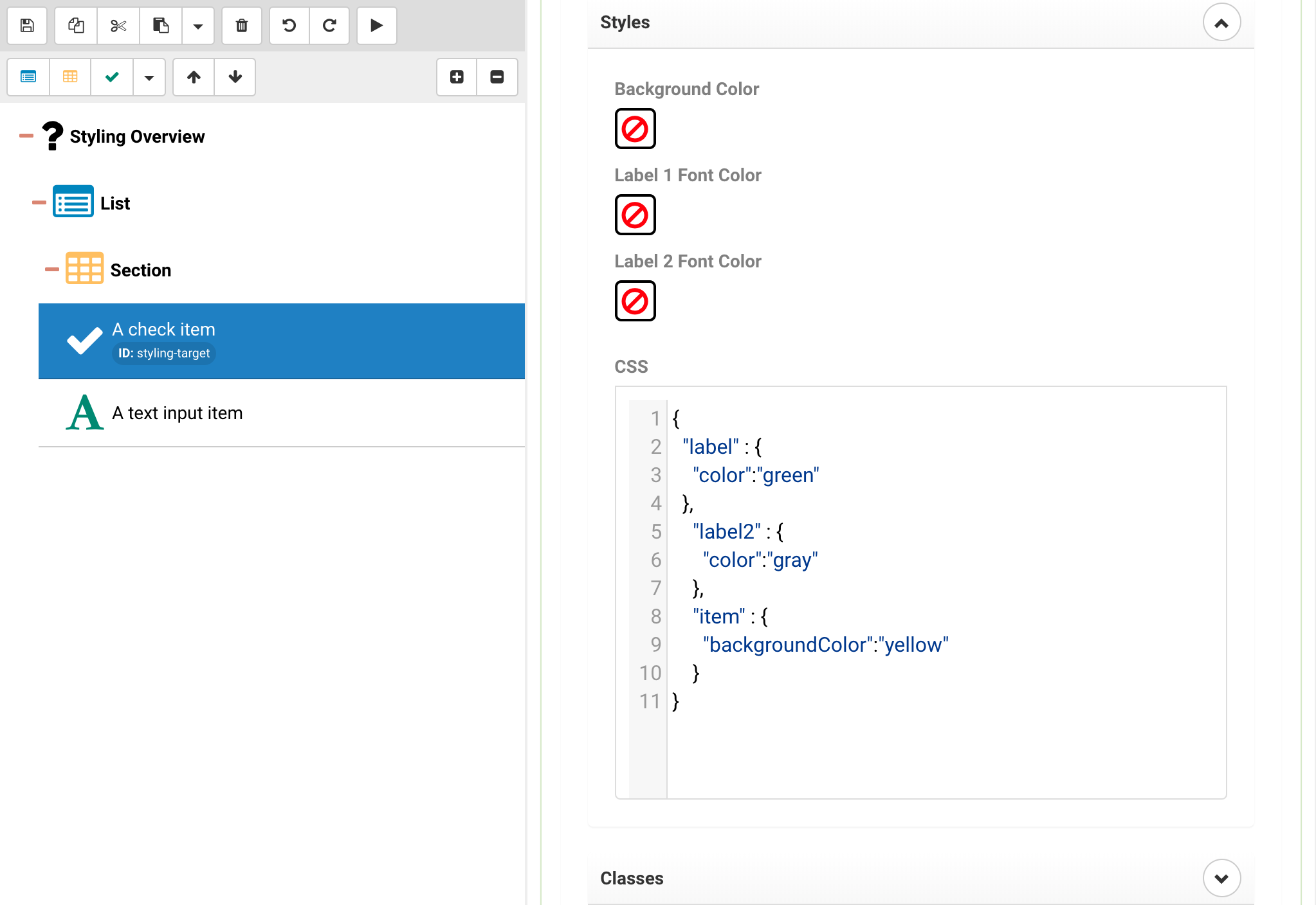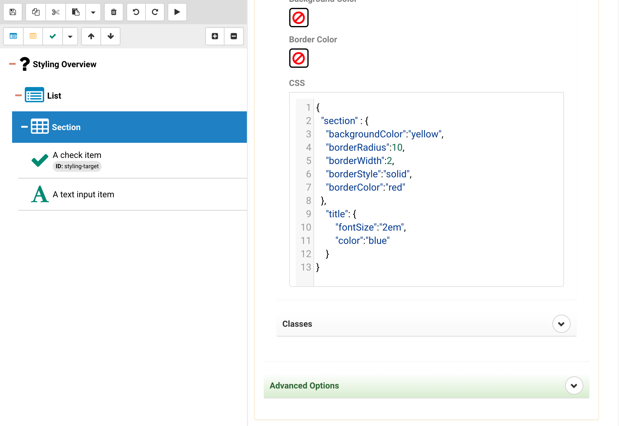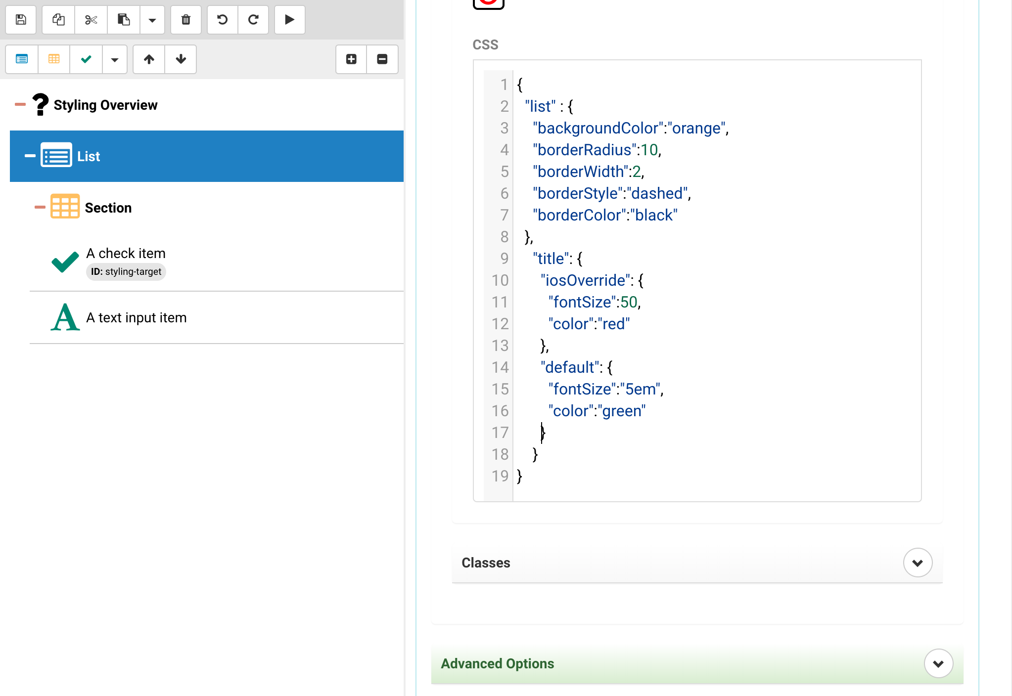 - Styles- Available on Lists, Sections and Items, allow to specify inline styles that are specific to one element. This is the same concept as CSS styles, best used for one-offs when there is no need to reuse styles.