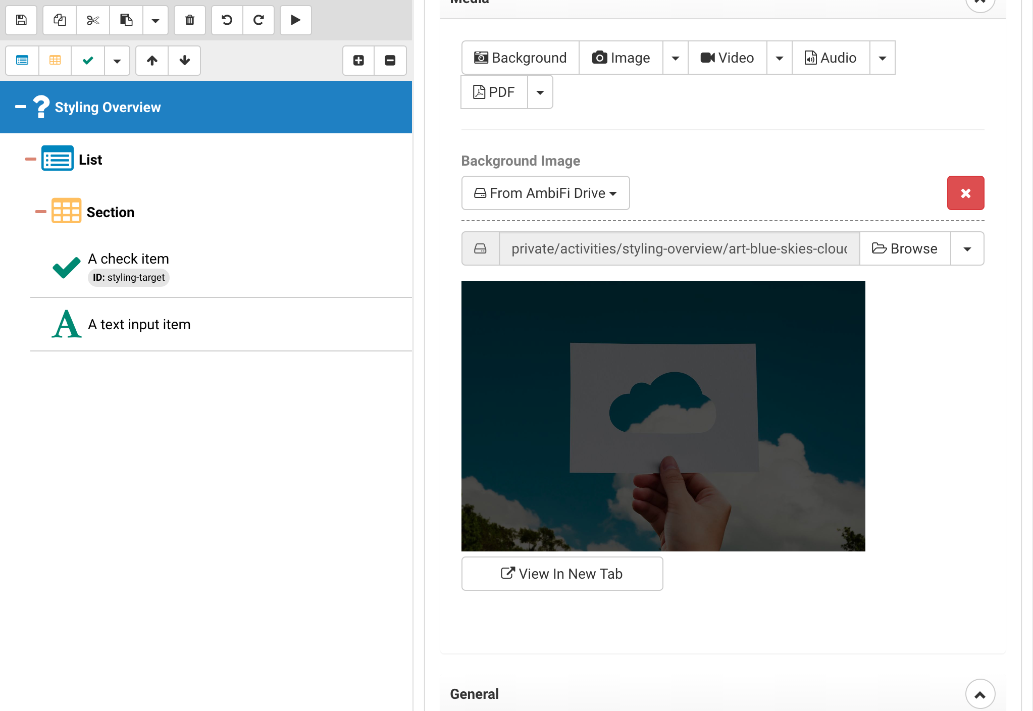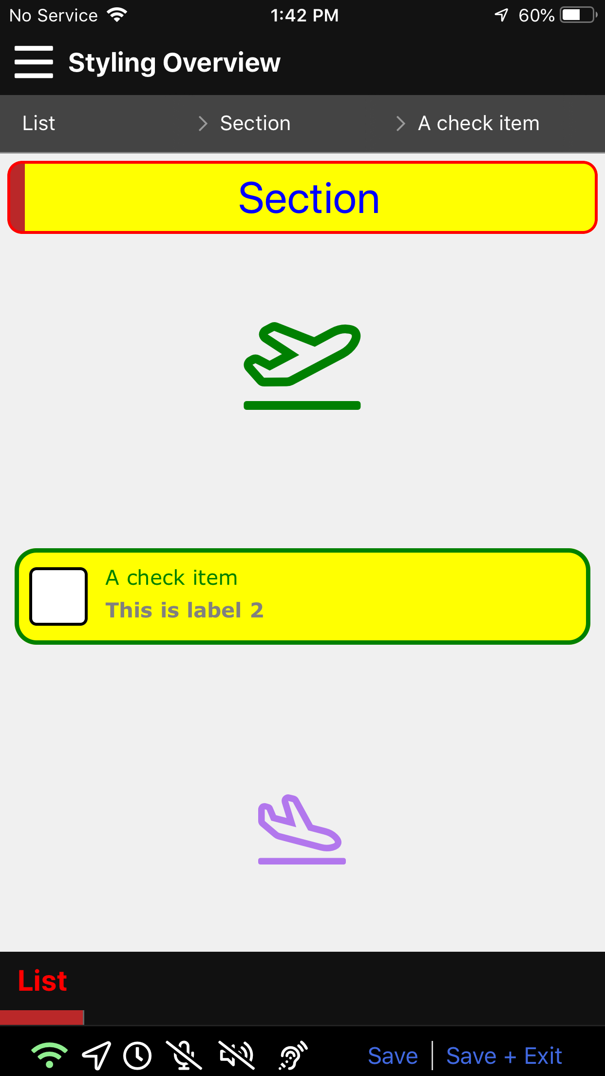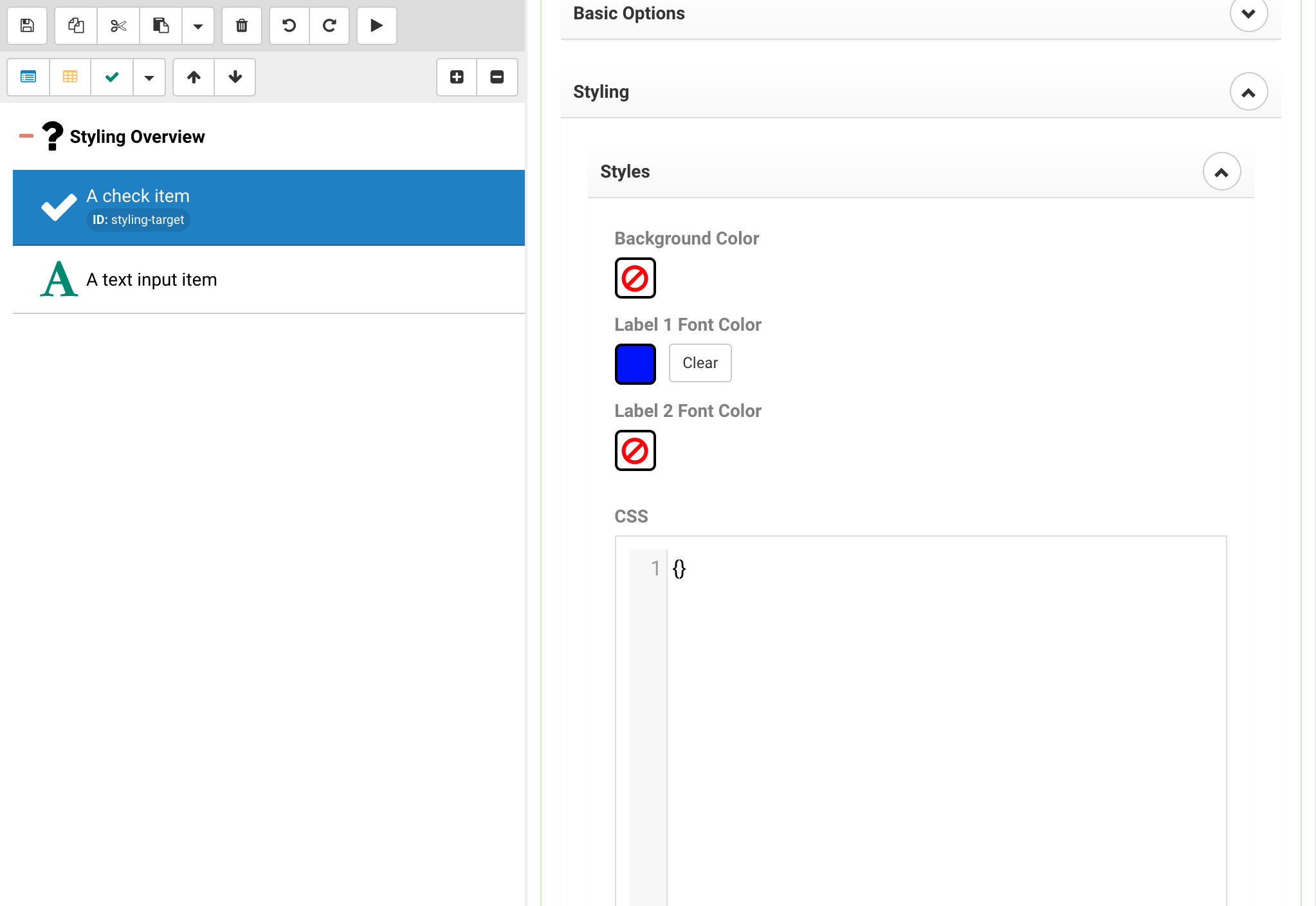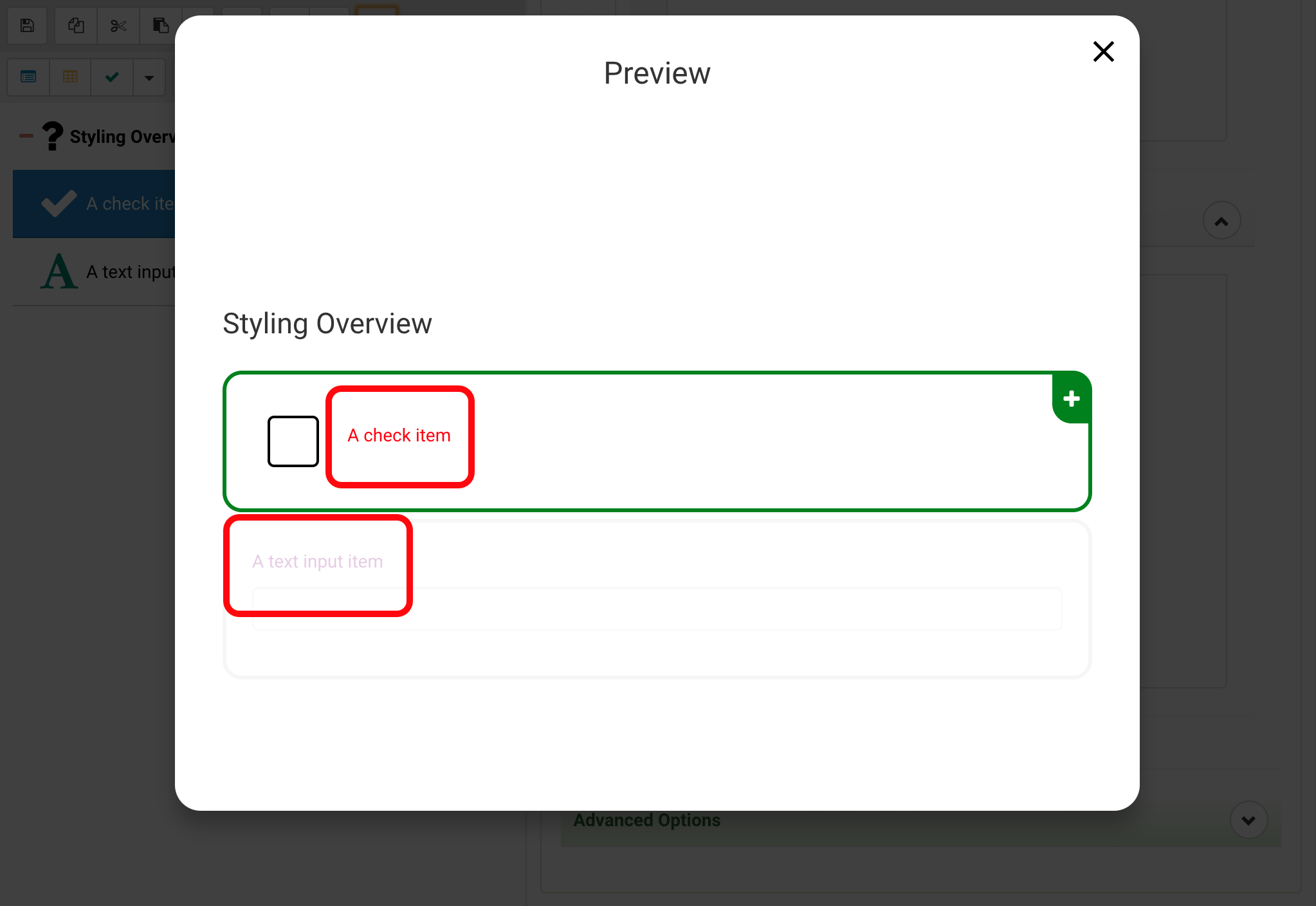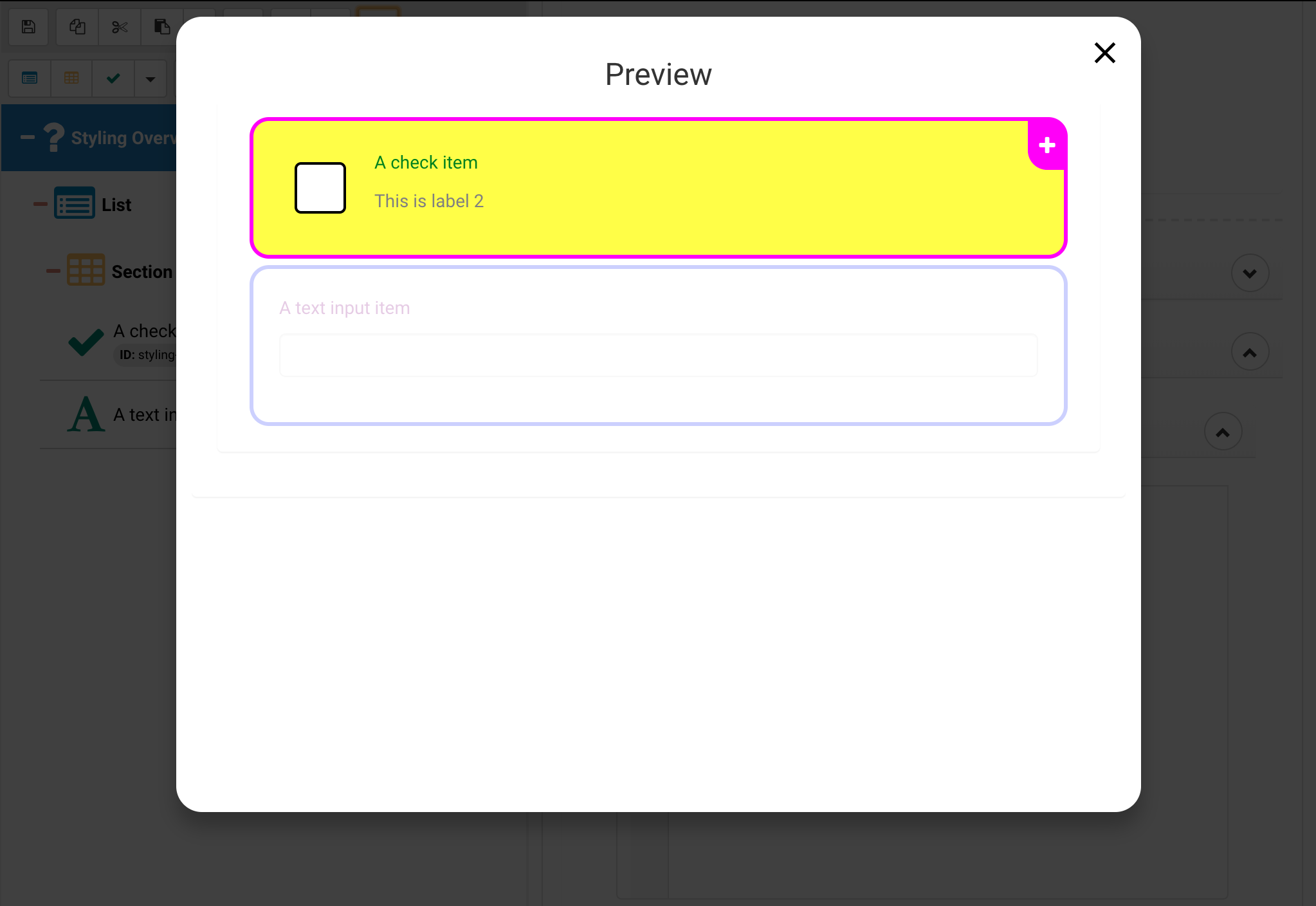 - Styles- Available on Lists, Sections and Items, allow to specify inline styles that are specific to one element. This is the same concept as CSS styles, best used for one-offs when there is no need to reuse styles.