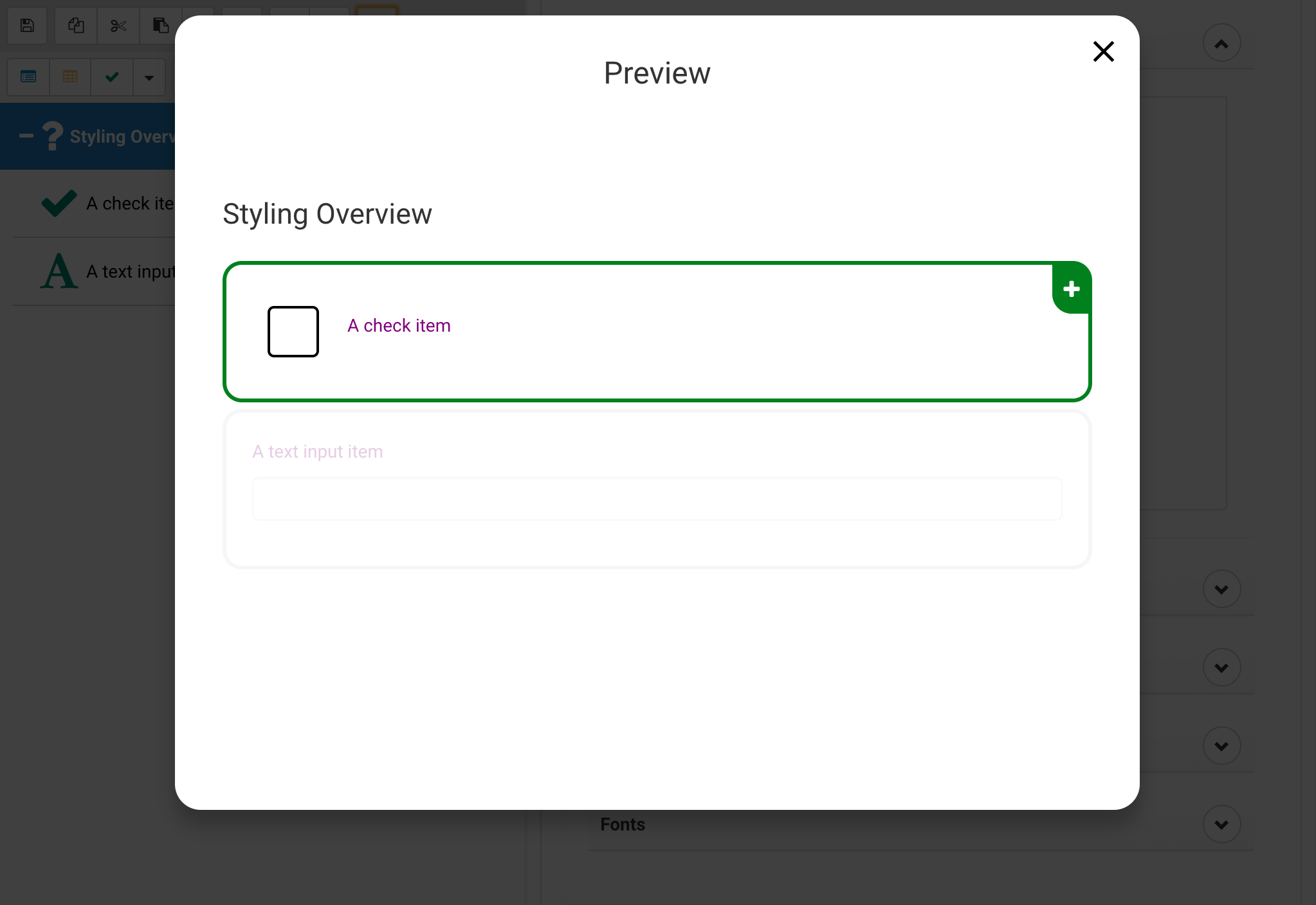 Items for the main content and data collection layer of an activity. They can be checkboxes, textboxes, date and time fields and much more. For more on item types please see Item types