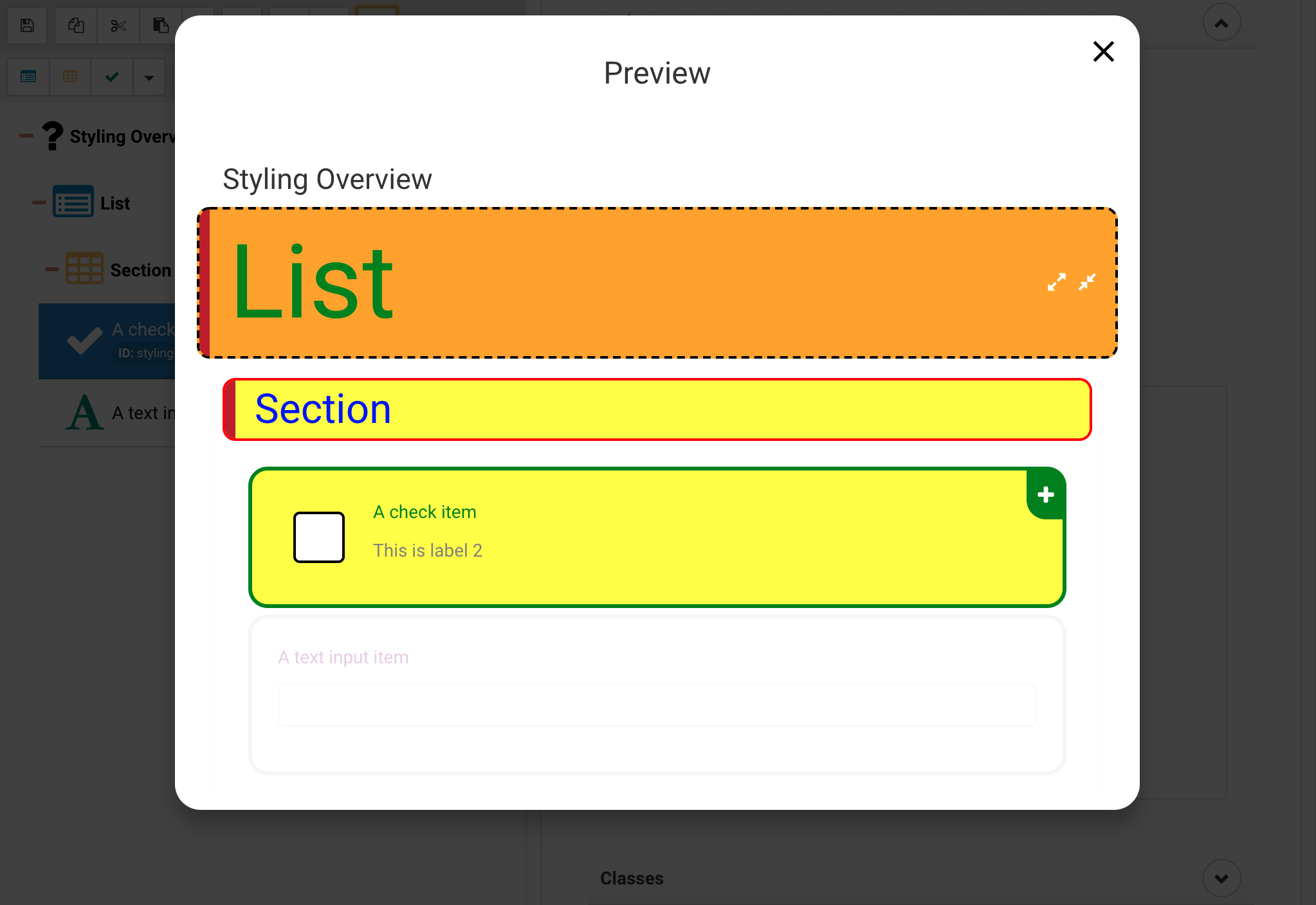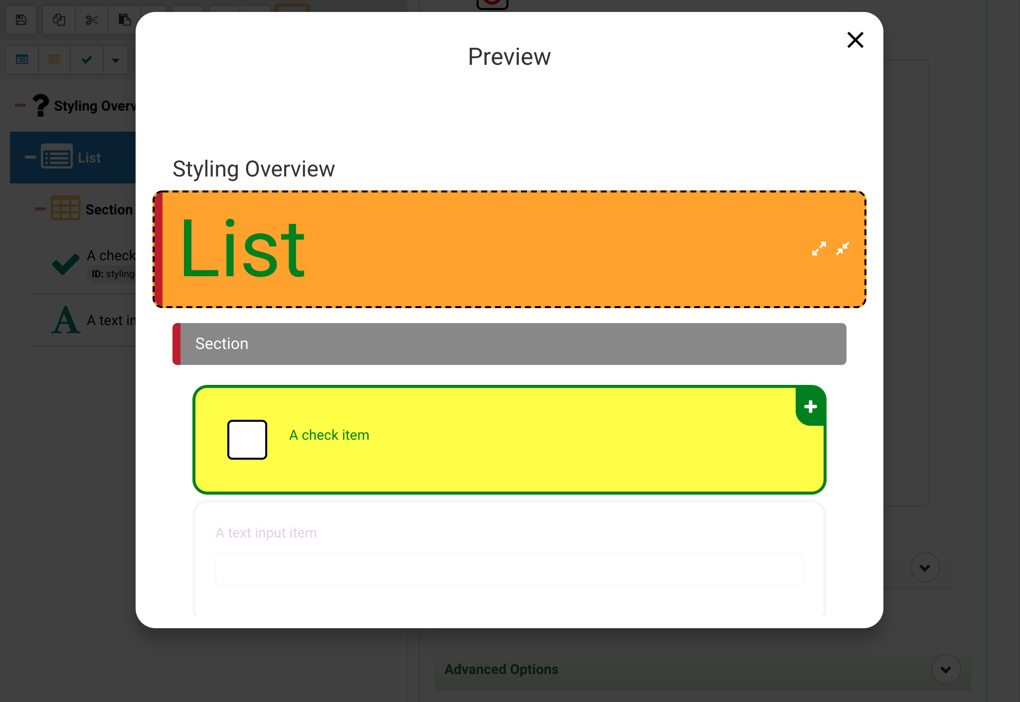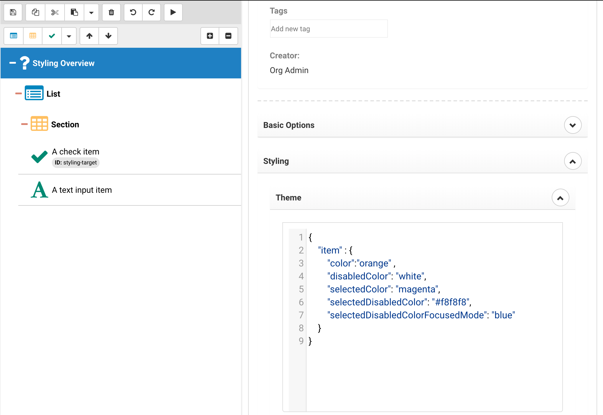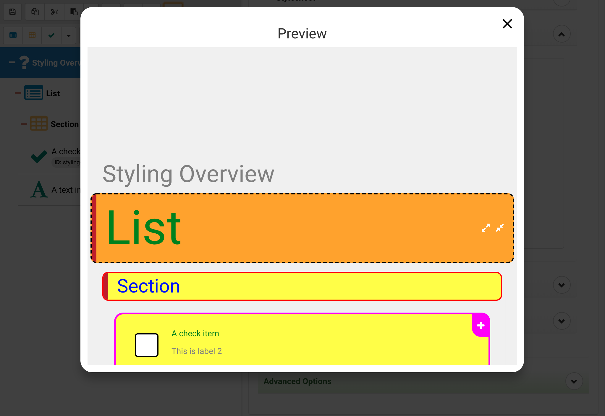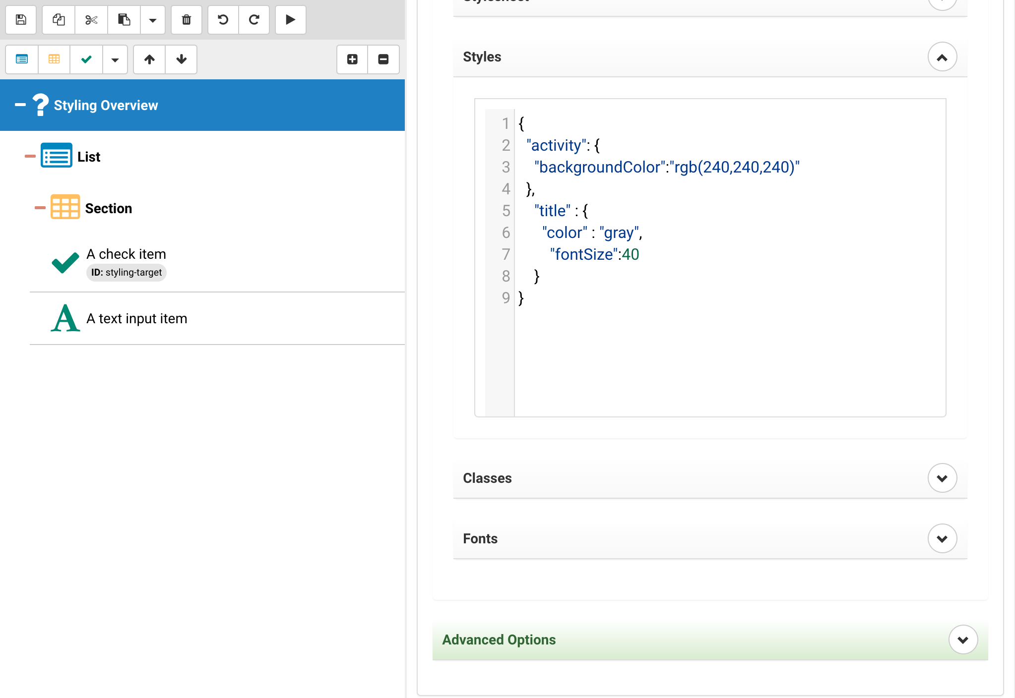 - Styles- Available on Lists, Sections and Items, allow to specify inline styles that are specific to one element. This is the same concept as CSS styles, best used for one-offs when there is no need to reuse styles.