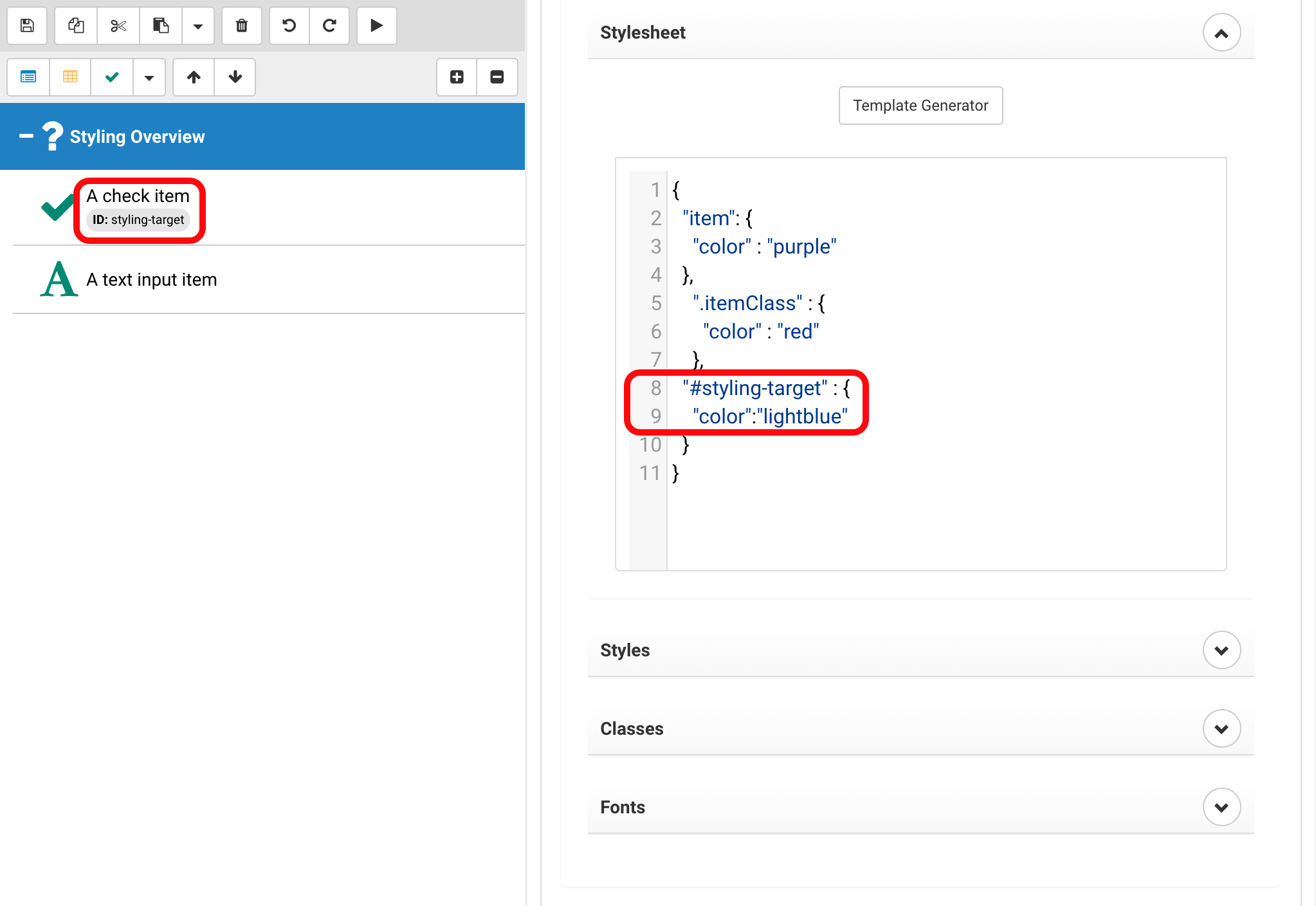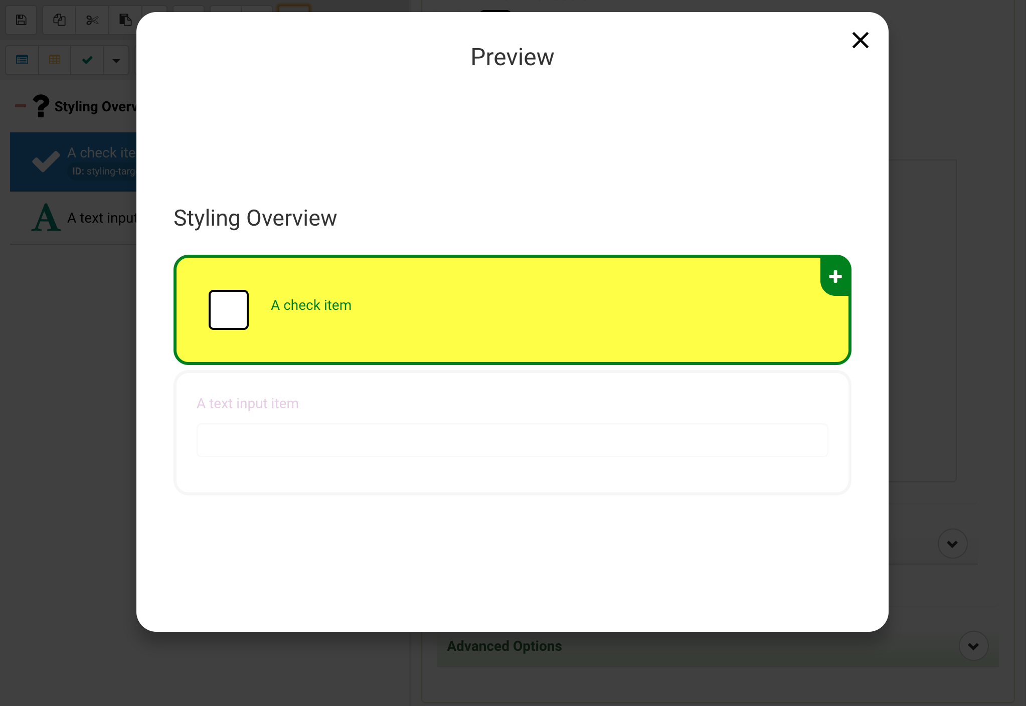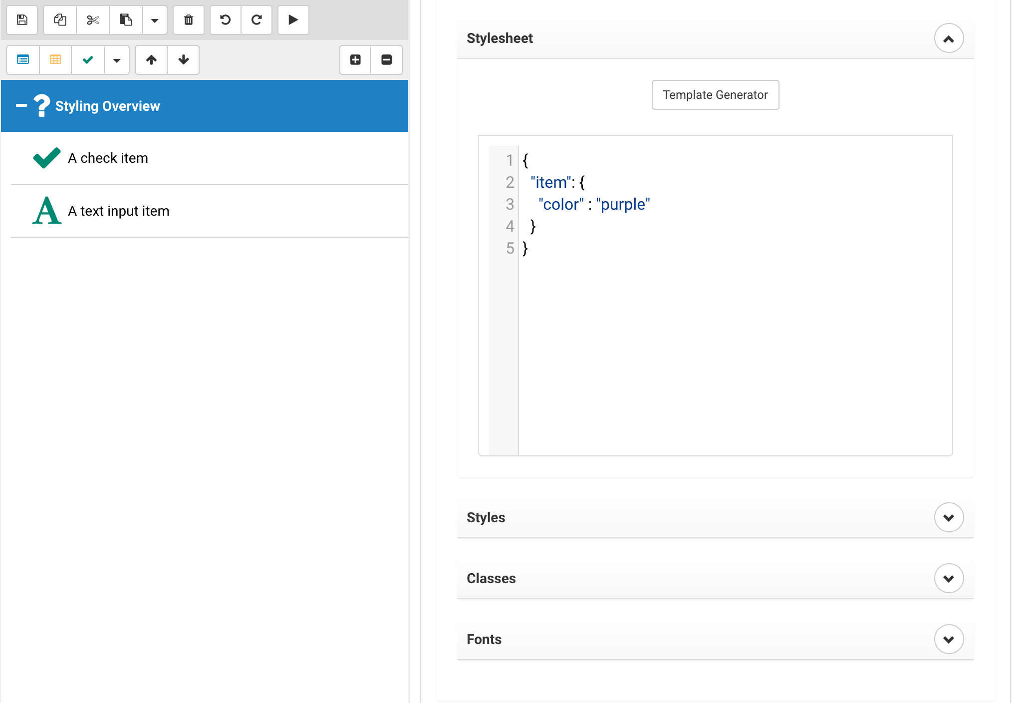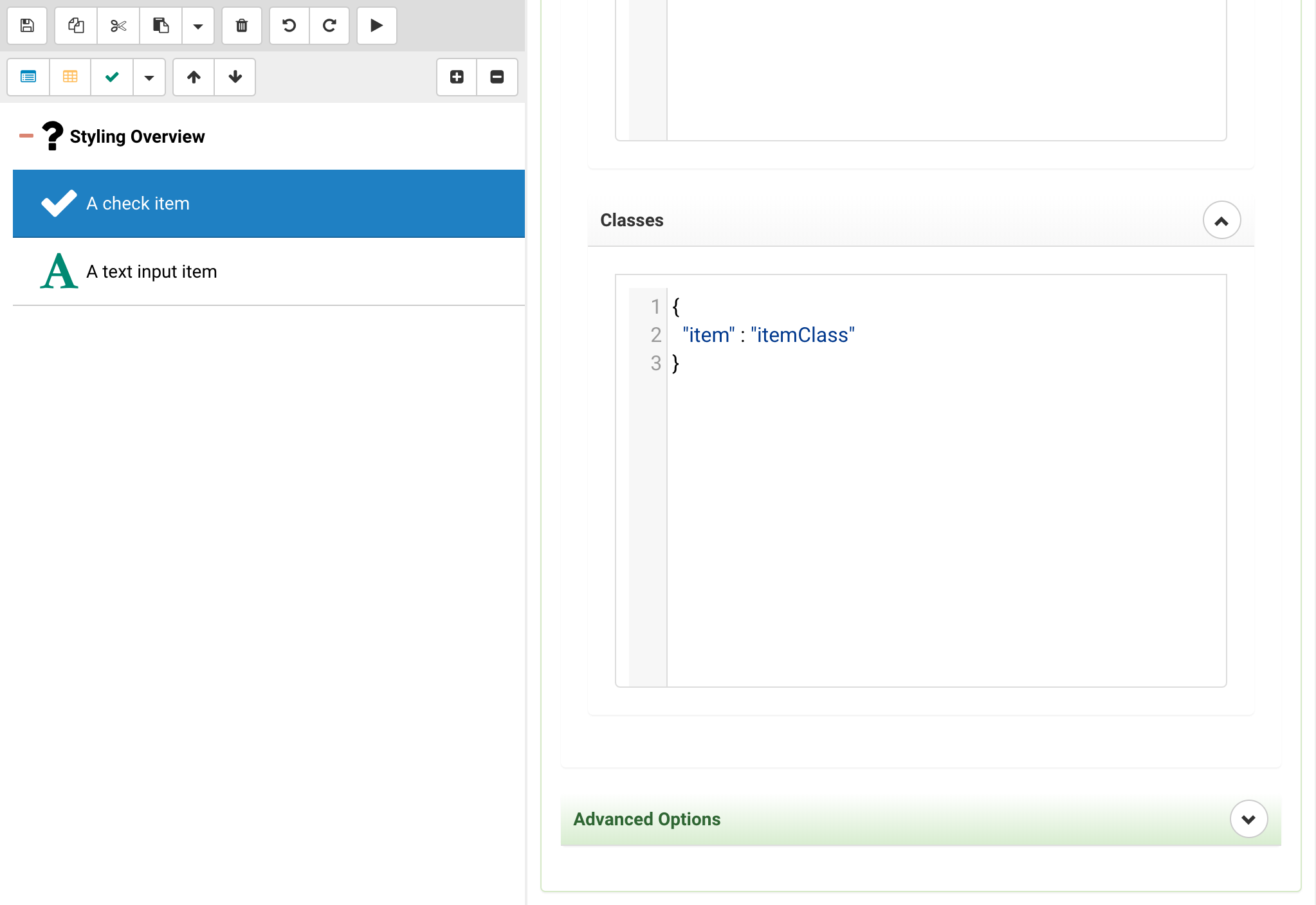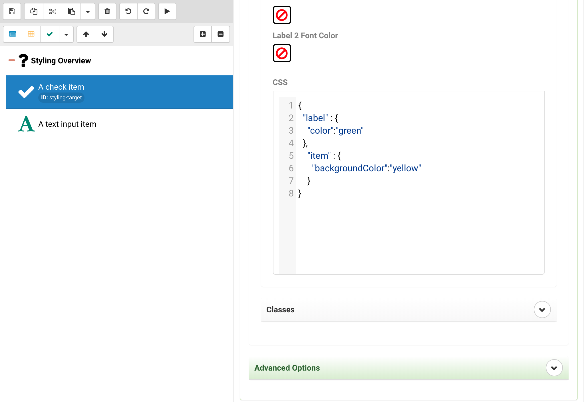 - Styles- Available on Lists, Sections and Items, allow to specify inline styles that are specific to one element. This is the same concept as CSS styles, best used for one-offs when there is no need to reuse styles.