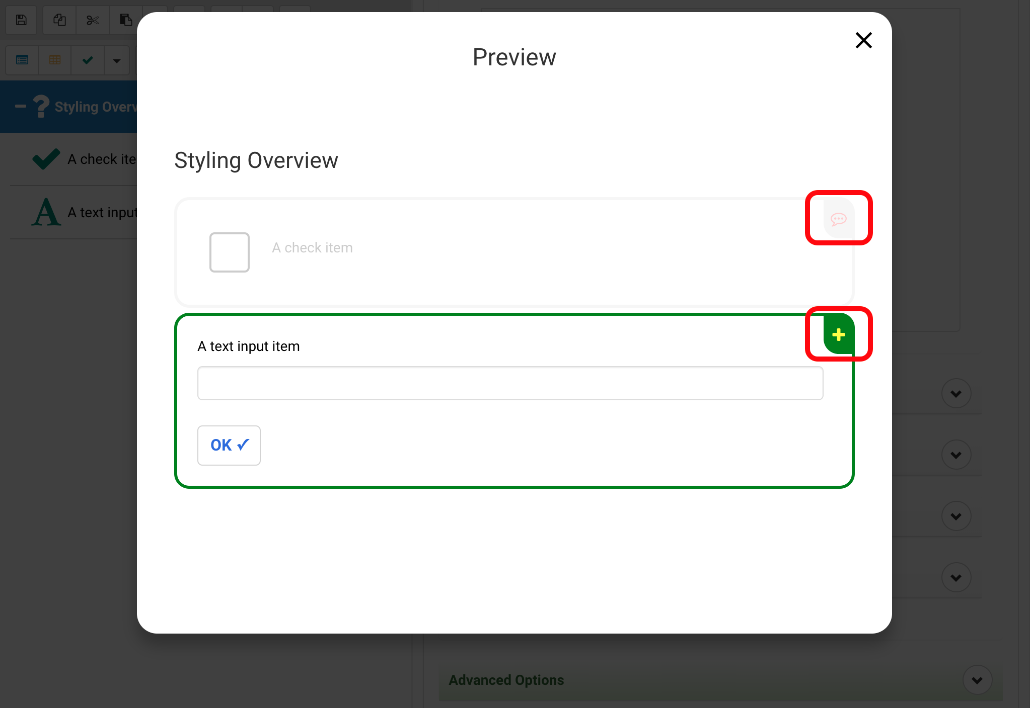 Items for the main content and data collection layer of an activity. They can be checkboxes, textboxes, date and time fields and much more. For more on item types please see Item types