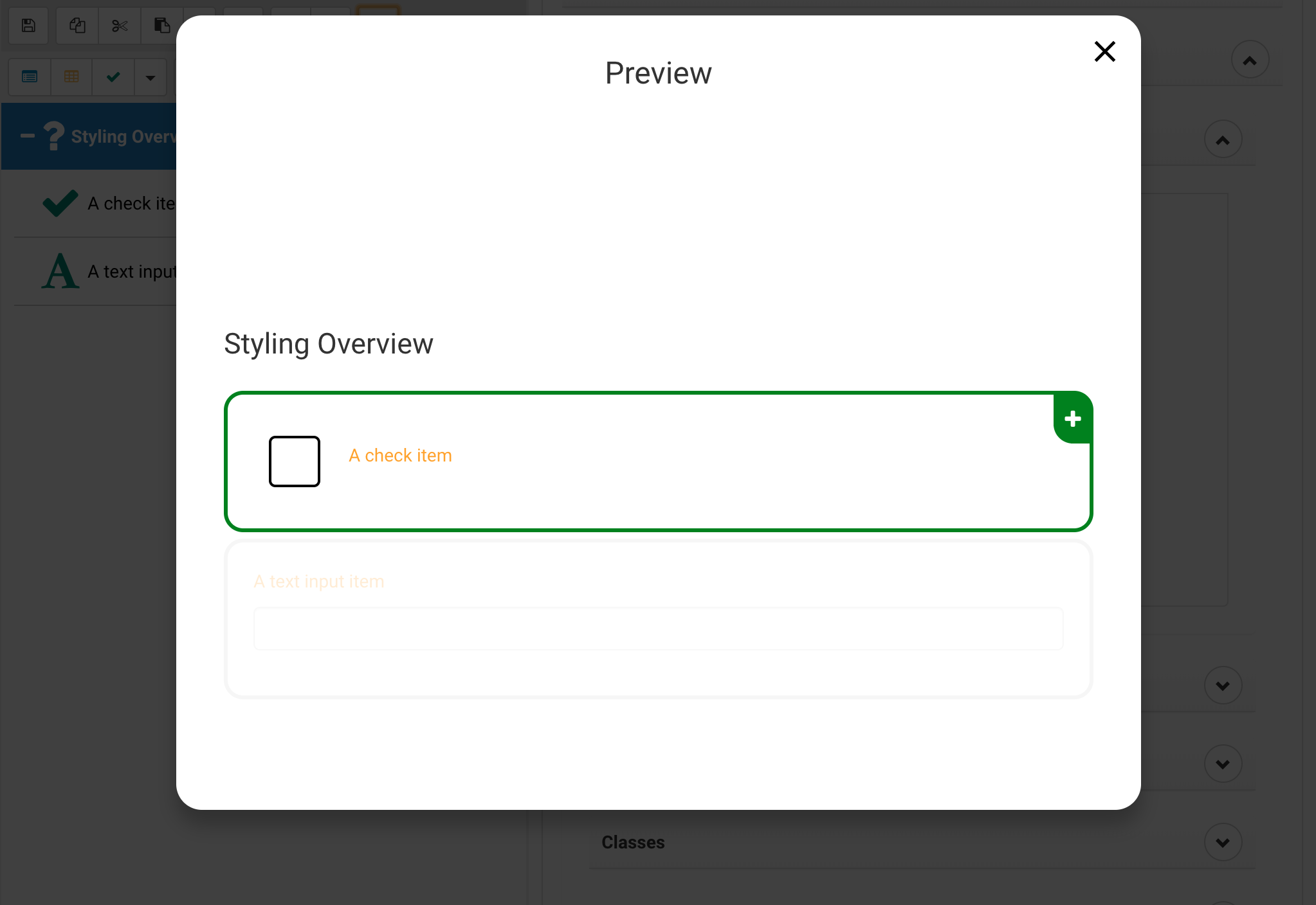 - Classes- Available on Lists, Sections and Items, allow an author to define a class in the Stylesheet and assign them via the class property, multiple classes can be assigned with spaces between the class names (same as CSS/HTML).